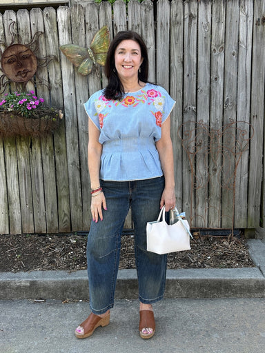 Brighten your wardrobe with this charming cap sleeve top featuring a serene light blue base adorned with vibrant embroidered florals in hues of pin...