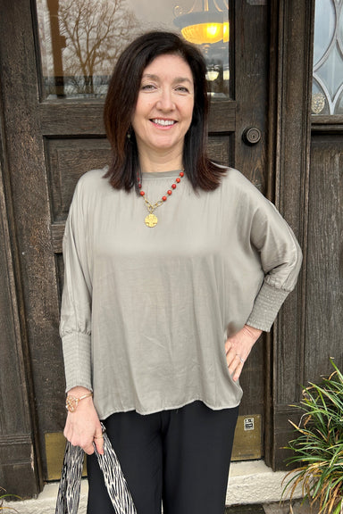 Our Puffed Sleeve Blouse comes in a beautiful burgundy color. It has 3/4 length puffed sleeves and an elastic waistband. It's short, but not cropp...