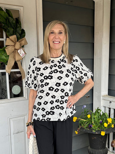 Discover understated luxury with this captivating short sleeve sequined top. Adorned with shimmering black sequins that catch light beautifully, it...