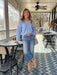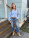 This medium-weight V-neck pullover sweater in a beautiful light blue shade features contrasting cream trim and stylish off-the-shoulder sleeves. Its versatile design lets you wear it alone for a chic look or easily layer it for added warmth and style.
