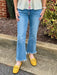 These medium denim jeans feature a high-rise fit with a trendy cropped, straight-leg silhouette. The frayed hem adds a stylish edge, making them perfect for seamless transition into fall wardrobes. Combining comfort and fashion, they offer a flattering shape that pairs effortlessly with seasonal layers.