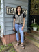 Tara is wearing a size small in the top, and paired it with our High Rise w/ Wide Cropped Frayed Ankle Jeans - Medium Denim.