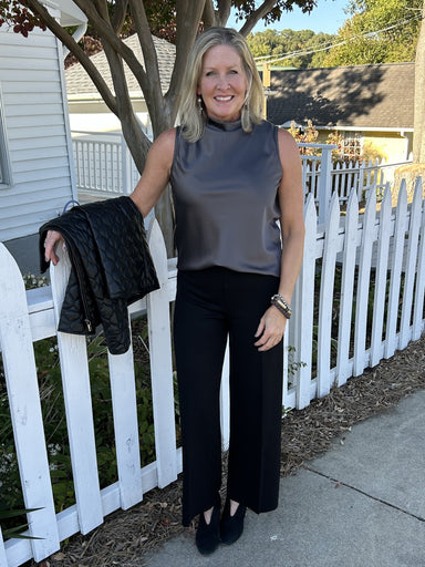 This stunning Justine Draped Mock Neck Shell Top in a beautiful Gray Ash color is the perfect addition to any wardrobe. With its silky feel and sle...