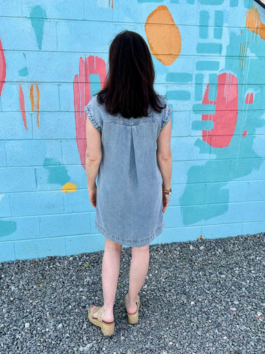 Timeless denim style with modern versatility. This sleeveless wisteria dress features a crisp light wash, flattering V-neck with collar detail, and...