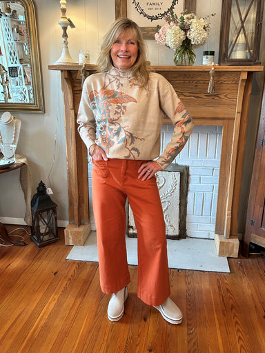 This Short Sleeve Ornate Design Top showcases a beautiful brown and beige print, perfectly capturing the warmth of fall colors. Its contrasting vel...