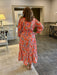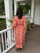 This Contrasting V-Neck Maxi Dress features a vibrant colorful pattern set against a warm orange background, enhanced by striking contrasting trim. The gathered waist flatters your silhouette, creating an elegant and comfortable fit perfect for any occasion.