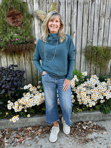 Embrace cozy elegance with this long sleeve cowl neck knit sweater in a stunning lagoon hue. Its soft, breathable fabric offers all-day comfort, pe...