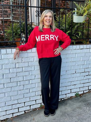 Spread holiday cheer in this vibrant red Christmas sweater featuring playful puffy letters spelling "Merry." The tactile, dimensional lettering ad...