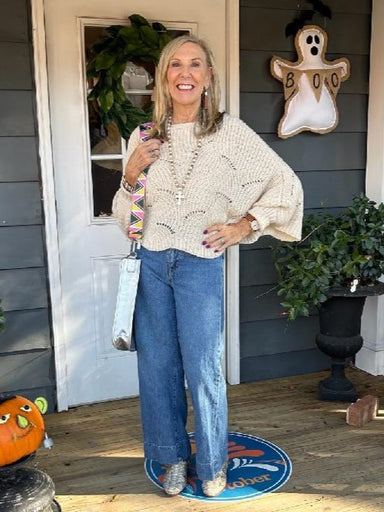 How cute is this crocheted sweater?! With a boat neck, dolman sleeve, an open weave, and a scalloped hem, it is so simple but adorable! We are cal...