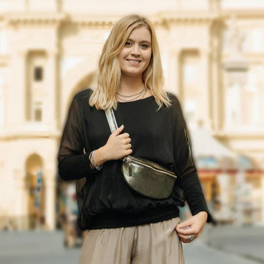 This beautiful crossbody/sling bag is chic and has a faux shearling texture. It has a beautiful silhouette with an adjustable strap. It is trimmed ...
