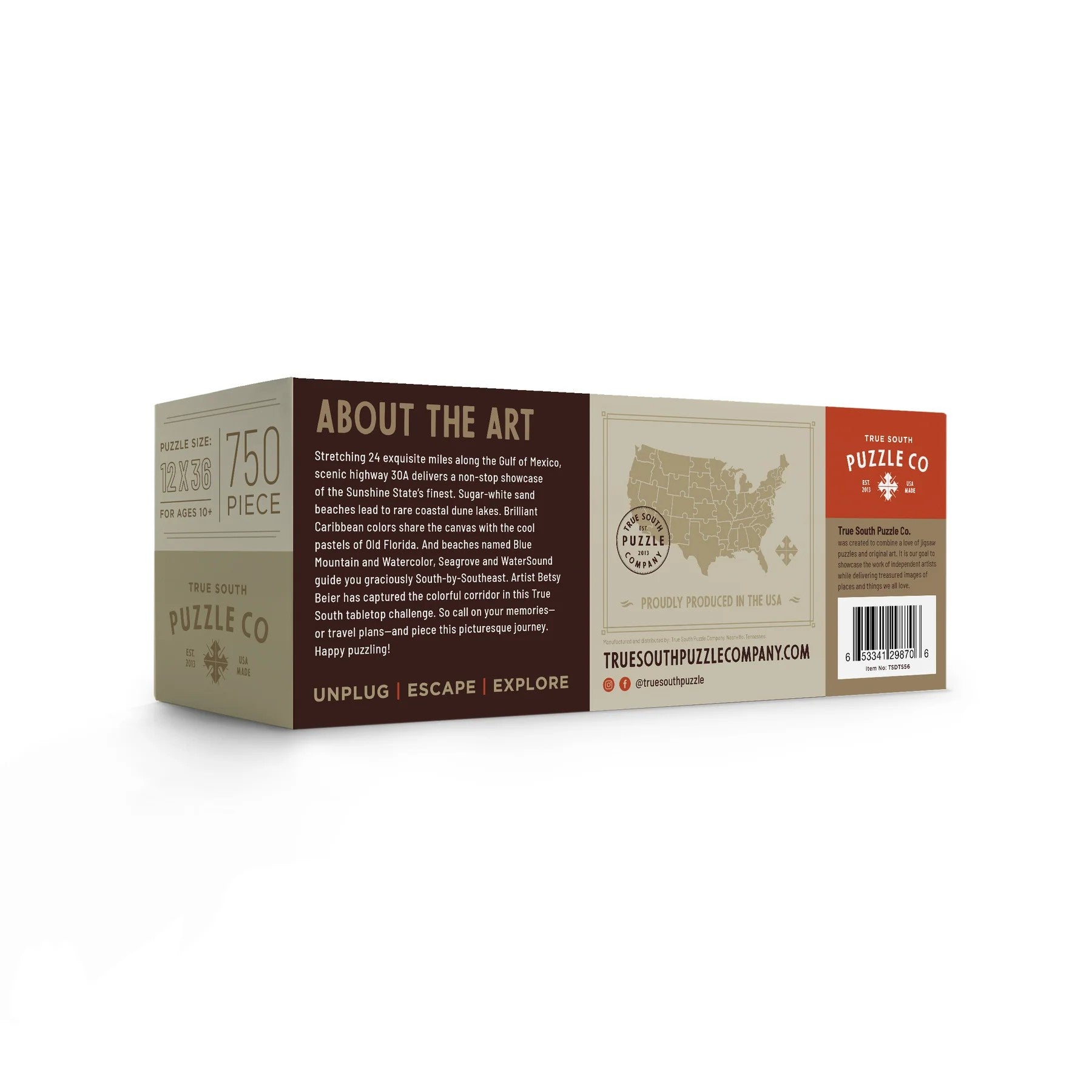 Stretching 24 exquisite miles along the Gulf of Mexico, scenic highway 30A delivers a non-stop showcase of the of the Sunshine State’s finest. Sugar-white sand beaches lead to rare coastal dune lakes and brilliant Caribbean colors share the canvas with the cool pastels of Old Florida. Artist Betsy Beier has captured the colorful corridor in this True South tabletop challenge. So call on your memories—or travel plans—and piece this picturesque journey.