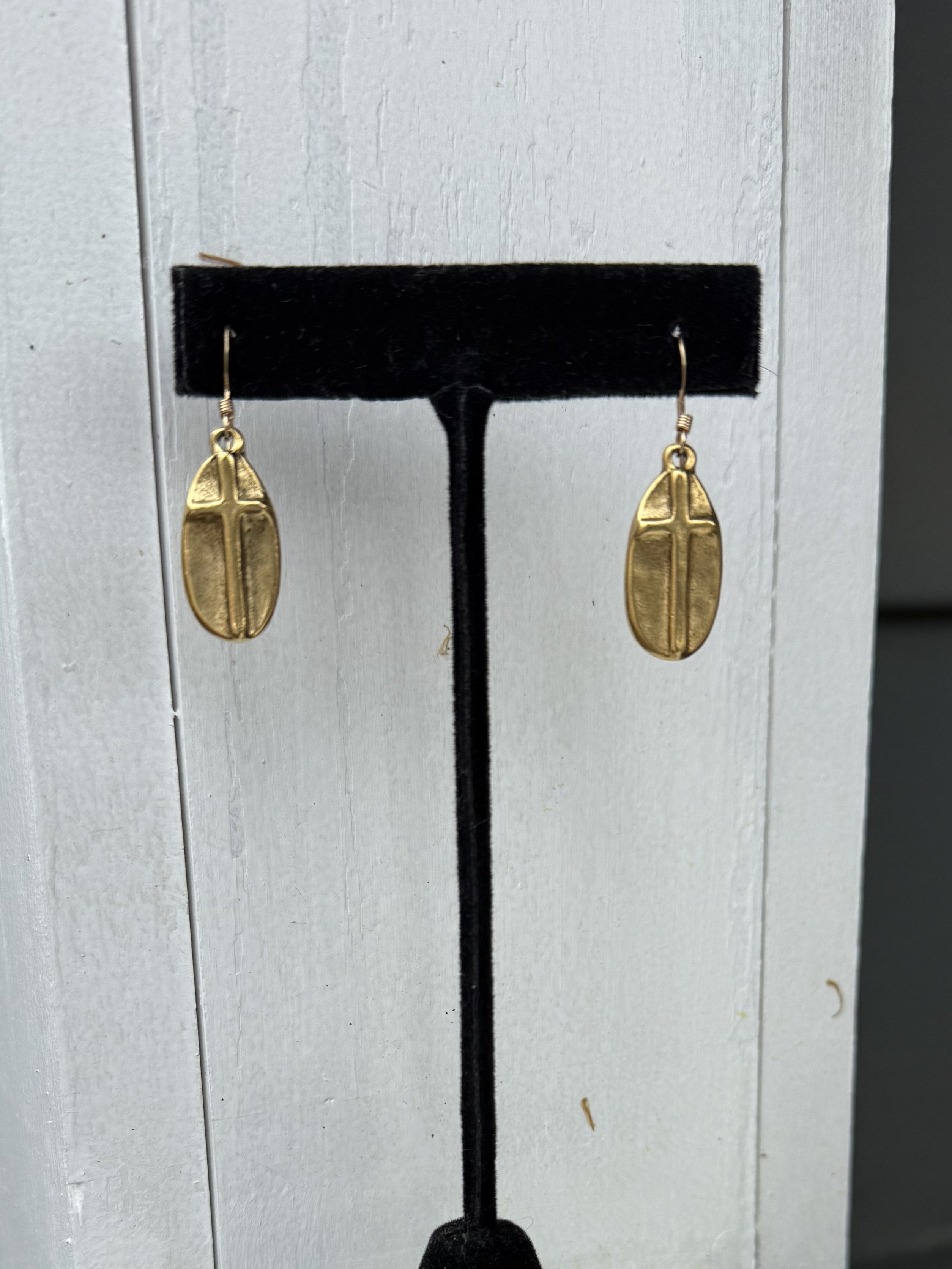 These lovely cross earrings are handmade in Atlanta. They are simple and make a statement, in a matte gold finish. The cross on the oval-shaped background is stunning.